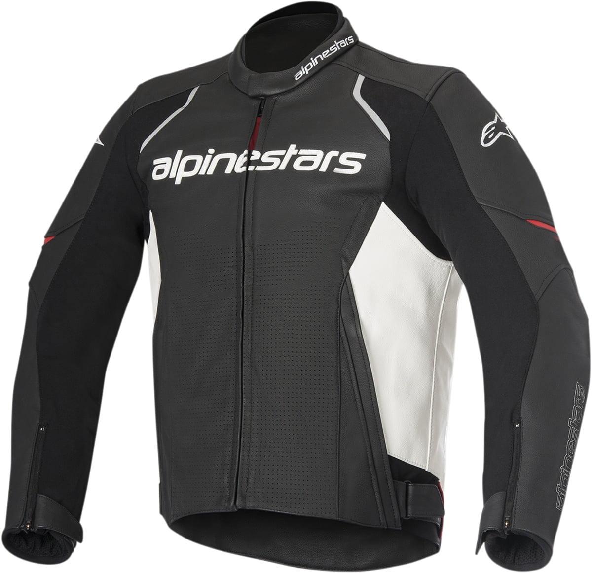 Waist connection zipper allows attachment to alpinestars riding jackets. Alpinestars missile leather motorcycle jacket black/white/red 50. Highly durable, full grain 1.1mm leather main construction for superb abrasion resistance, with reinforced, multiple stitching for optimum tear resistance in the event of an impact. Mesh and comfort textile collar, plus snap button closure for comfort.